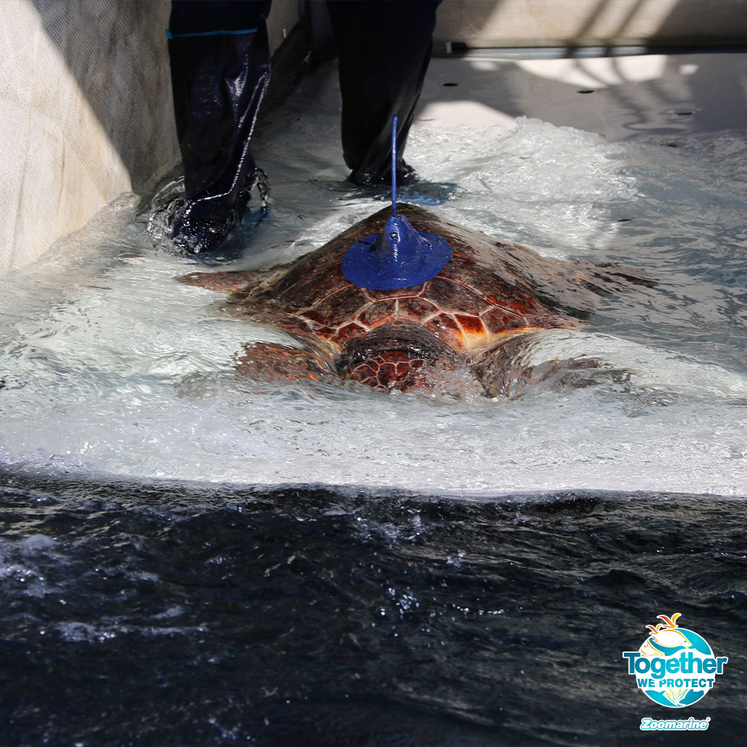 In June 2021, fishermen found a loggerhead turtle caught in fishing gear in the Guadiana River, around 19 km from the sea. Unable to reach the surface to breathe, the animal was rescued and brought to Porto d’Abrigo, the Zoomarine Algarve rehabilitation centre. The diagnosis? Anaemia and a fishing hook lodged in her stomach.